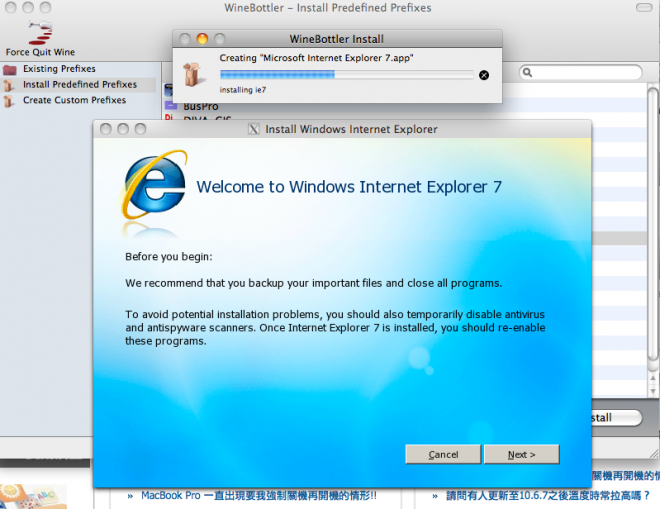 到中途匯出現類似在windows安裝IE的畫面,請按下一步繼續安裝。